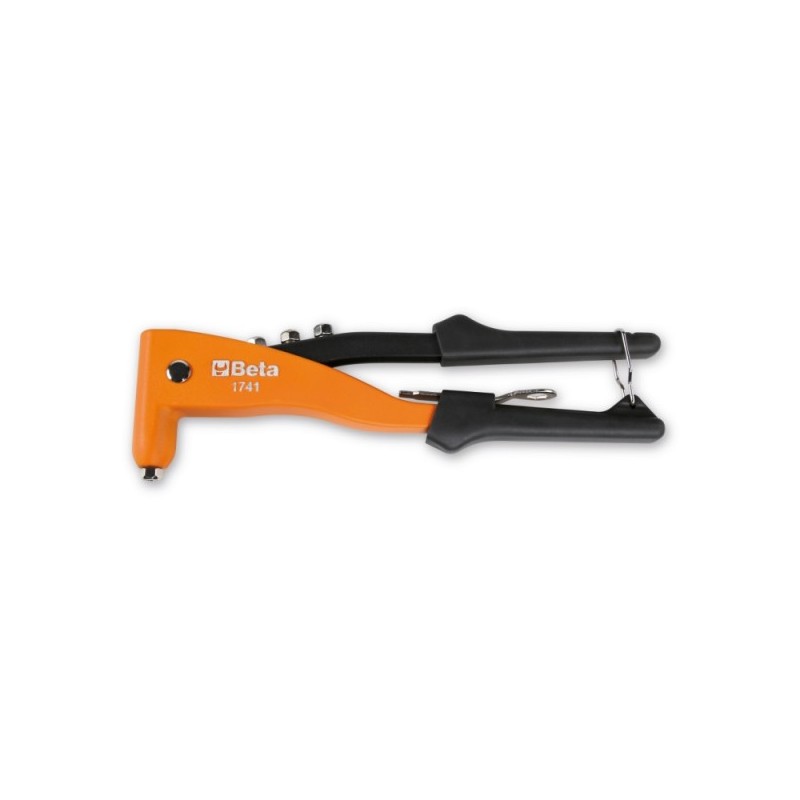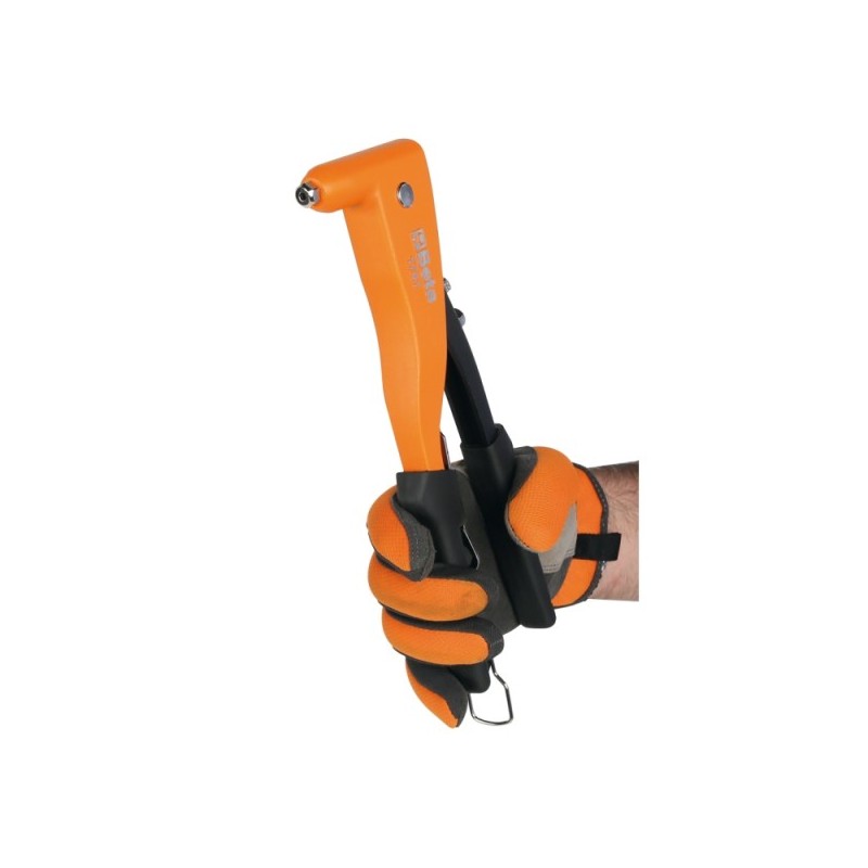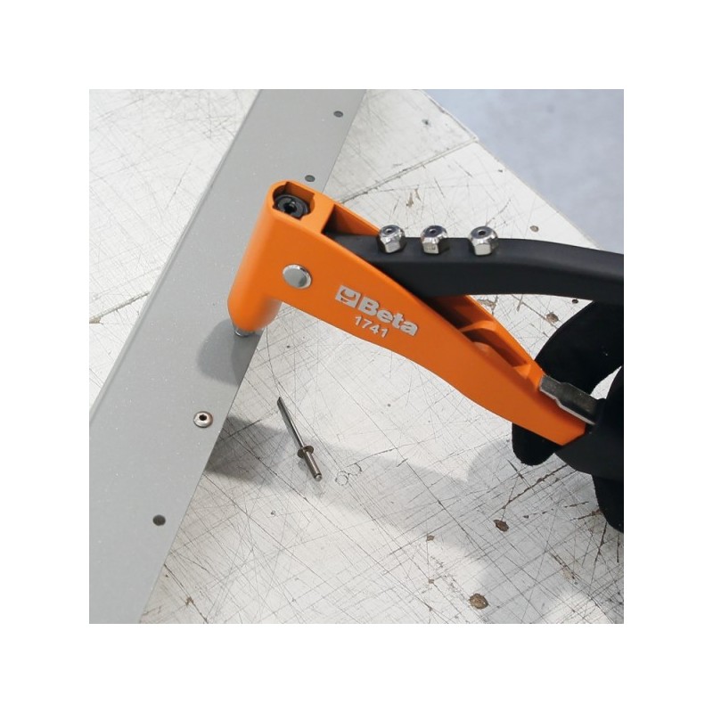 Compacta y ligera, destaca por su versatilidad, con 4 boquillas intercambiables para remaches de aluminio y acero (2,4 - 5 mm) y acero inoxidable (2,4 - 4 mm)